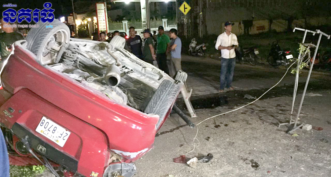 ភ្នំពេញ ៖ បុរសម្នាក់បើករថយន្តចេញមកពីខួបកំណើត នៅម្តុំព្រែកលៀប ត្រឡប់ទៅផ្ទះវិញបើកលឿនពេកធ្លាក់ចូលជង្ហុករេចង្កូតជ្រុលបុកខឿន បណ្តាលឲ្យក្រឡាប់ផ្ងារជើងផ្លោងបុកបាក់បង្គោលភ្លើងបំភ្លឺផ្លូវមួយដើម ហេតុការណ៍នេះបានកើតឡើងកាលពីវេលាម៉ោង១១យប់ថ្ងៃទី១៥ ខែកញ្ញា ឆ្នាំ២០១៧ តាមបណ្តោយផ្លូវជាតិលេខ៦ នៅចំណុចមុខផ្ទះសំណាក់មហាលាភ ស្ថិតនៅក្នុងសង្កាត់ព្រែកលៀប ខណ្ឌជ្រោយចង្វារ។