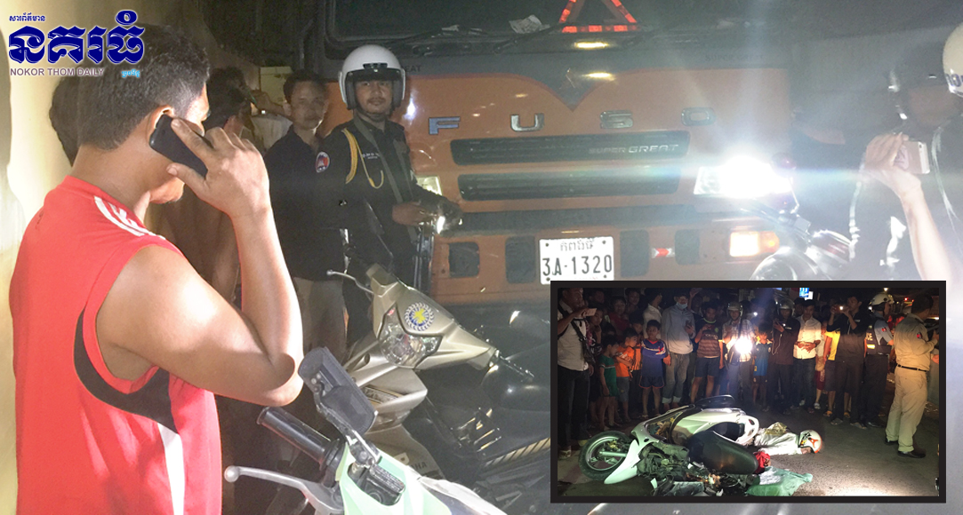 ភ្នំពេញ ៖ បុរសម្នាក់កំពុងតែជិះម៉ូតូធ្វើដំណើរតាមផ្លូវ ក៍ស្រាប់តែរថយន្តសណ្តោងដឹកដែក មួយគ្រឿង បានធ្វើរដំណើរមកក្នុងទិសដៅស្របគ្នា ជ្រុលទៅបុកនិងកិនលើពីក្រោយម៉ូតូ បណ្តាលឲ្យអ្នកបើកម៉ូតូធ្លាយពោះវៀនស្លាប់នៅនឹងកន្លែង ហេតុការណ៍នេះកើតឡើងនៅវេលាម៉ោង៧និង១០នាទីយប់ ថ្ងៃទី២៨ ខែកញ្ញា ឆ្នាំ២០១៧ ជិតបុរីហាយលែន ផ្លូវ៣៧១ ភូមិត្នោតជ្រុំ៤ សង្កាត់បឹងទំពុន២ ខណ្ឌមានជ័យ ។