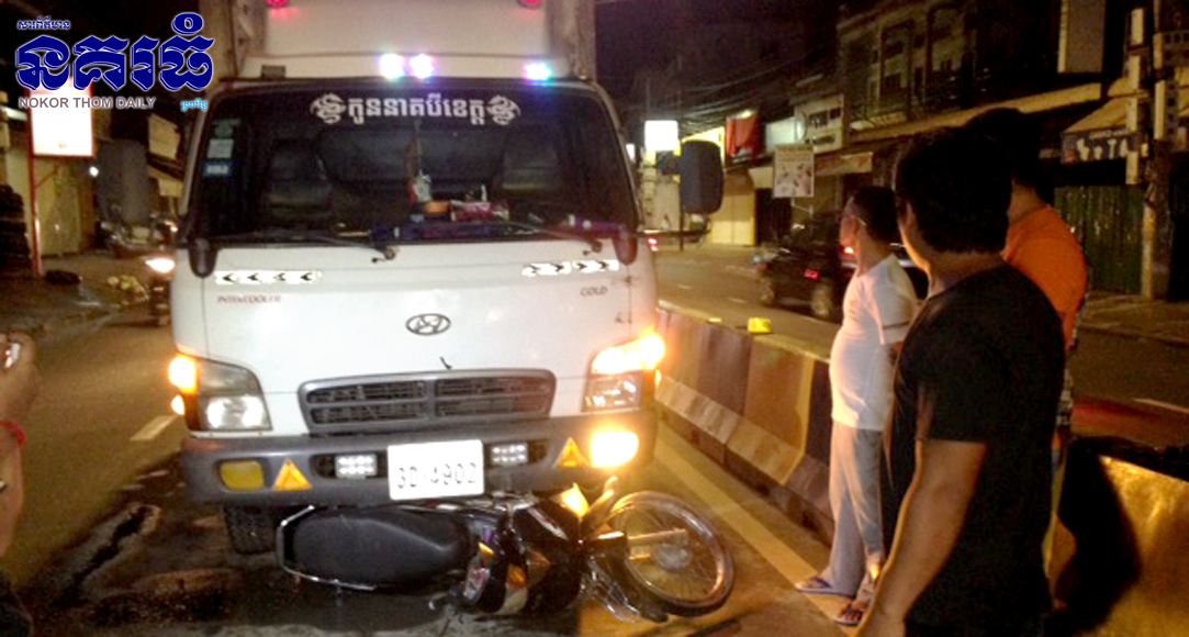 ភ្នំពេញ ៖ បុរសពីរនាក់ជិះម៉ូតូហុងដាឌ្រីម មួយគ្រឿង បោះពួយយ៉ាងលឿន ហើយព្យាយាមវ៉ាជែងពីមុខ ក៏ត្រូវរថយន្តកូរ៉េបើកទៅបុកពីក្រោយ បណ្តាលឲ្យម៉ូតូកៀបជាប់ក្រោយរថយន្តអូសជិត១០ម៉ែត្រ រងការខូចខាត ហេតុការណ៍នេះកើតឡើងកាលពីវេលាម៉ោង៨និង១០នាទីយប់ ថ្ងៃទី៣ ខែតុលា ឆ្នាំ២០១៧ ត្រង់ចំណុចខាងត្បូងរង្វង់មូលកាំកូស៊ីធីប្រមាណ២០០ម៉ែត្រ តាមបណ្តោយផ្លូវ៣៥៥ ស្ថតិក្នុងសង្កាត់បឹងកក់ទី២ ខណ្ឌទួលគោក។
