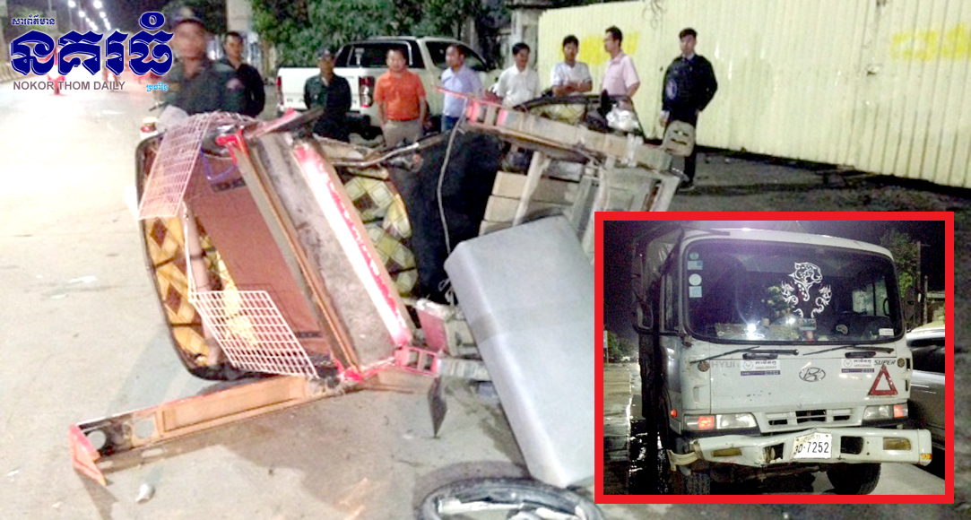 ភ្នំពេញ ៖ ​បុរសម្នាក់កំពុងតែបើករ៉ឺម៉កម៉ូតូបត់ត្រឡប់ក្រោយ ត្រូវរថយន្តដឹកទំនិញបើកលឿនពេក ចាប់ហ្រ្វាំងមិនទាន់ជ្រុលទៅបុកពេញទំហឹង បណ្តាលឲ្យរ៉ឺម៉កម៉ូតូក្រឡាប់ខ្ទាតទៅចិញ្ចើមផ្លូវ ធ្វើ​ឲ្យអ្នកបើករ៉ឺម៉កម៉ូតូរងរបួសធ្ងន់ ​ហេតុការណ៍នេះកើតឡើងកាលពីវេលាម៉ោង១០និង៣០នាទីយប់ ថ្ងៃទី០៣ ខែតុលា ឆ្នាំ២០១៧ ត្រង់ចំណុចខាងត្បូងក្រុមហ៊ុនវីតាល់ ១០០ម៉ែត្រ តាមបណ្តោយផ្លូវ៥៩៨ ស្ថិតក្នុងសង្កាត់ទួលសង្កែ ខណ្ឌឬស្សីកែវ ។