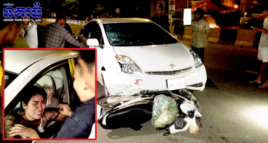 ភ្នំពេញ ៖ កាលពីវេលាម៉ោង៤និង១៥នាទីទៀបភ្លឺ ថ្ងៃទី៥ ខែតុលា ឆ្នាំ២០១៧ ស្រ្តីវ័យក្មេងស្រស់ស្អាតម្នាក់សង្ស័យស្រវឹងស្រា បើករថយន្តម៉ាកព្រូសមួយគ្រឿង បោះពួយយ៉ាងលឿន ក៏ជ្រុលទៅបុកម៉ូតូវ៉េវមួយគ្រឿងទៀត ចំពីក្រោយពេញទំហឹង បណ្តាលឲ្យម៉ូតូកៀបជាប់ក្រោមរថយន្តតាំងពីមុខស្ថានីយប្រេងឥន្ធនៈតូតាល់ តាមបណ្តោយផ្លូវ២៨១ ស្ថិតក្នុងសង្កាត់បឹងសាឡាង ខណ្ឌទួលគោក ហើយរថយន្តបង្កមិនបានឈប់ចុះមកធ្វើការដោះស្រាយនោះទេ គឺព្យាយាម បើករត់គេចខ្លួនទាំងកៀបជាប់ម៉ូតូក្រោមរថយន្ត រហូតទៅដល់មុខហាងនំបុ័ងបាយ័ន ទើបរថយន្តបើកទៅមុខលែងរួច ក៏ត្រូវបានប្រជាពលរដ្ឋស្ទាក់ចាប់តែម្តង។