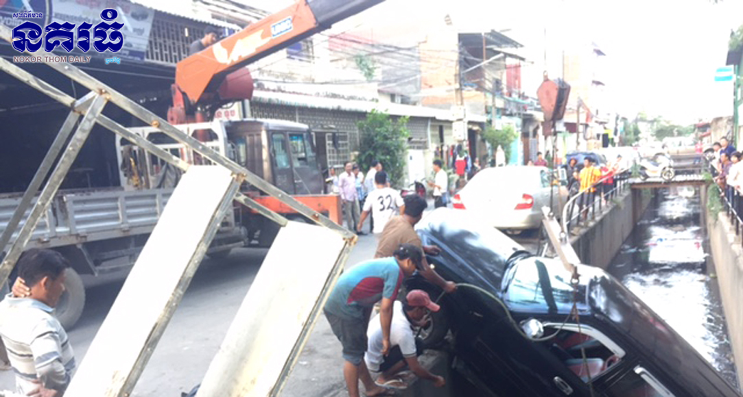ភ្នំពេញ ៖ ជាងជួសជុលរថយន្តពេលជួសជុលរថយន្តរួច បើករថយន្តម៉ាក CRV ពណ៍ខ្មៅ ពាក់ស្លាកលេខភ្នំពេញ ២I-៨៨៣៦ មិនប្រយ័ត្នក៏ធ្លាក់ចូលប្រឡាយ និងបាក់បង្កាន់ដៃមាត់ប្រឡាយជិត១០ម៉ែត្រ តែសំណាងល្អមិនអ្នកបើកបរមិនរបួសទេ ហេតុការណ៍នេះកើតឡើងកាលពីវេលាម៉ោង៥និង២០នាទីល្ងាច ថ្ងៃទី០៦ ខែតុលា ឆ្នាំ២០១៧ នៅចំណុចយានដ្ឋាន អូន ទូច តាមផ្លូវ៣៩៦ ក្រុម៤៨ ស្ថិតនៅភូមិ១ សង្កាត់បឹងកេងកងទី៣ ខណ្ឌចំការមន ។