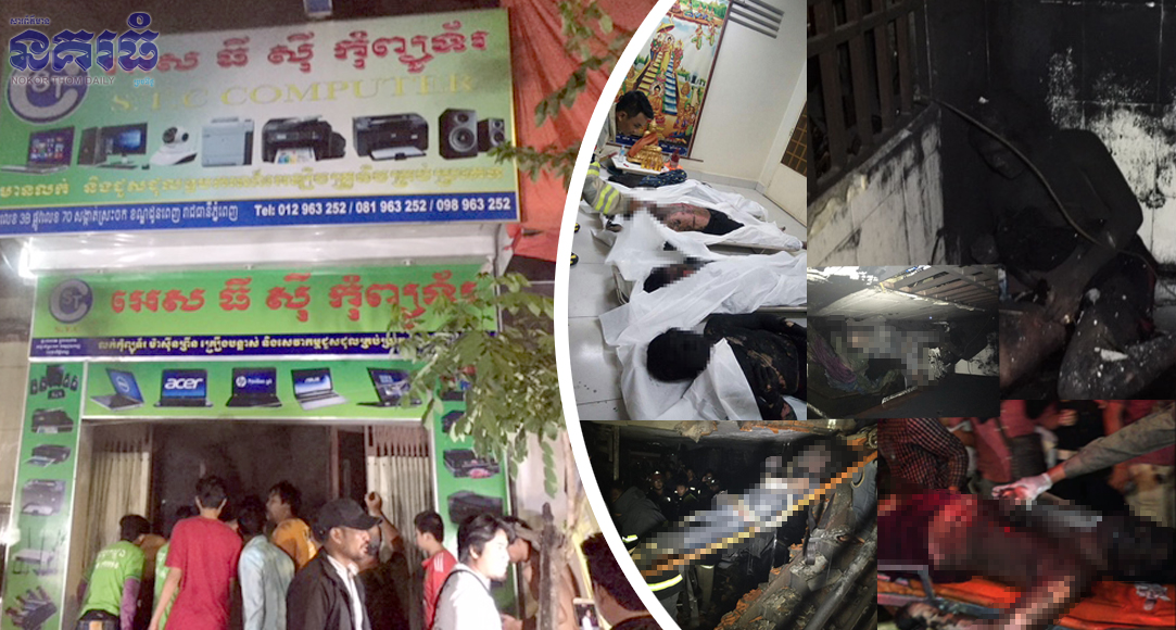 ភ្នំពេញ ៖ បើតាមសមត្ថកិច្ចអះអាងថា ផ្ទះ១ខ្នងលក់កុំព្យូទ័របានឆ្លងចរន្តអគ្គីសនីឆាបឆេះបណ្តាលឲ្យស្លាប់បុគ្គលិកចំនួន៤នាក់ និងឆាបឆេះសម្ភារៈអស់ទាំងស្រុង បង្កឲ្យមានការភ្ញាក់ផ្អើលកាលពីវេលាម៉ោង១១យប់ ថ្ងៃទី១៦ ខែតុលា ឆ្នាំ២០១៧ នៅចំណុចផ្ទះលេខ3B លក់កុំព្យូទ័រយីហោអេស ធី ស៊ី តាមបណ្តោយផ្លូវ៧០ ស្ថិតនៅក្នុងភូមិ១៩ សង្កាត់ស្រះចក ខណ្ឌដូនពេញ។