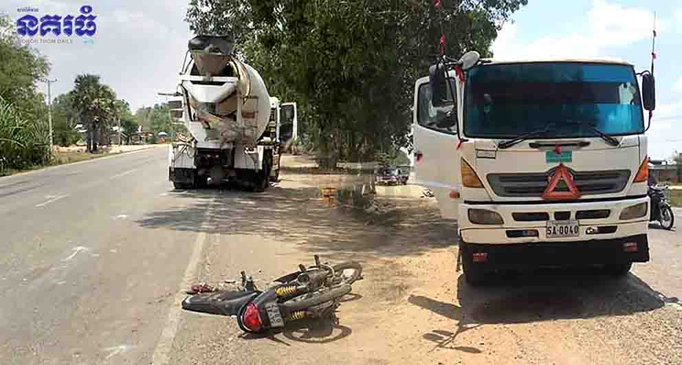 ខេត្តស្វាយរៀង ៖ រថយន្តក្រឡុកស៊ីម៉ង់ត៍មួយគ្រឿង បានបើកបរដោយខ្វះការយោគយល់ មិនគោរពសិទ្ធិអាទិភាព ក៏ជ្រុលទៅបុកម៉ូតូ ១គ្រឿង រួចក៏ជ្រុលកិនបុរសចំណាច់ជាអ្នកជិះម៉ូតូ បណ្តាលឱ្យបែកក្បាលធ្លាយខួរស្លាប់យ៉ាងអាណោចអាធ័ម កាលពីវេលាម៉ោង៩ និង១០នាទី ព្រឹក ថ្ងៃទី១១ ខែមេសា ឆ្នាំ២០១៨ នៅលើកំណាត់ផ្លូវជាតិលេខ១ ត្រង់ចន្លោះបង្គោលគីឡូម៉ែត្រលេខ១៤៤-១៤៥ ស្ថិតក្នុងភូមិសាមគ្គី សង្កាត់ ច្រកម្ទេស ក្រុងបាវិត។