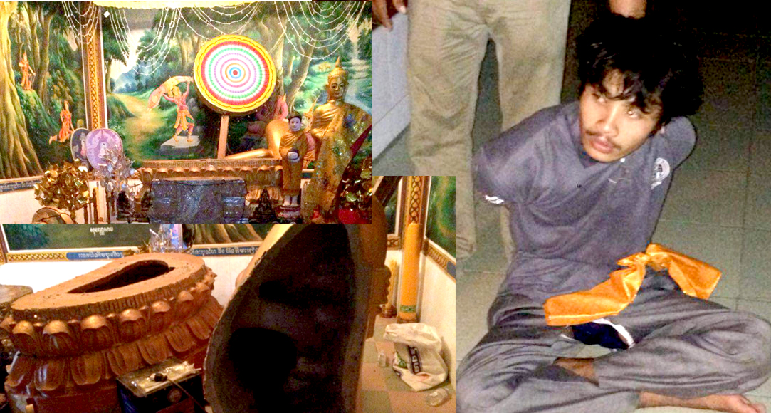 លោកតាអាចារ្យប្រចាំវត្តនាងកុក បានរៀបរាប់ប្រាប់ថា នៅមុនពេលកើតហេតុ គេឃើញក្មេងស្ទាវម្នាក់ទំនងជាទើបនឹងប្រើប្រាស់ថ្នាំញៀនរួច បានដើរចូលមកអុកឡុកពេញវត្ត និងបានឡើងទៅលើសាលាឆាន់វាយកំទេចព្រះពុទ្ធបដិមា បណ្តាលឱ្យបាក់បែកអស់ជាច្រើនអង្គ។ នៅពេលឃើញសភាពកោងកាចរបស់ក្មេងស្ទាវខាងលើ មិនមានអ្នកណាម្នាក់ហ៊ានចូលទៅឃាត់នោះទេ ទើបលោកតាបានរត់ទៅប្រាប់ប្រធានភូមិឱ្យមកជួយទប់ស្កាត់ ខណៈនោះដែរ លោកប្រធានភូមិ ក៏បានទូរស័ព្ទហៅនគរបាលប៉ុស្តិ៍ចុះមកឃាត់ខ្លួនជនដែលកំពុងចូលមកអុកឡុកក្នុងសាលាឆាន់នោះបានភ្លាមៗ ដោយចាប់ចងដៃទៅក្រោយឱ្យអង្គុយស្ងៀម ។