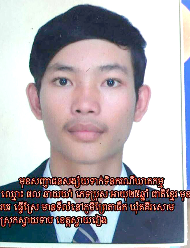 ជនដៃដល់ជាឃាតករ ដែលកាប់ឪពុកដាច់កស្លាប់គួរឱ្យរន្ធត់នេះ មានឈ្មោះផល ឆាយយ៉ា អាយុ២៥ឆ្នាំ មុខរបរកសិករ (កំពុងរត់គេចខ្លួន)។ ចំណែកជនរងគ្រោះជាឪពុក មានឈ្មោះសុខ មន អាយុ៥៥ឆ្នាំ មុខរបរកសិករ។ ទាំង២នាក់ឪពុកកូនខាងលើ មានទីលំនៅក្នុងភូមិឃុំកើតហេតុខាងលើ។