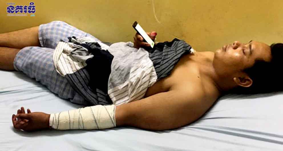 យុវជនរងគ្រោះ ដែលត្រូវជនសង្ស័យកាប់រយះដៃ មានឈ្មោះស៊ាន សុវត្ថិនានុ អាយុ២៤ឆ្នាំ រស់នៅភូមិចំការសំរោង១ សង្កាត់ចំការ សំរោង ក្រុងបាត់ដំបង (រងរបួសត្រង់ដៃខាងឆ្វេង)។
