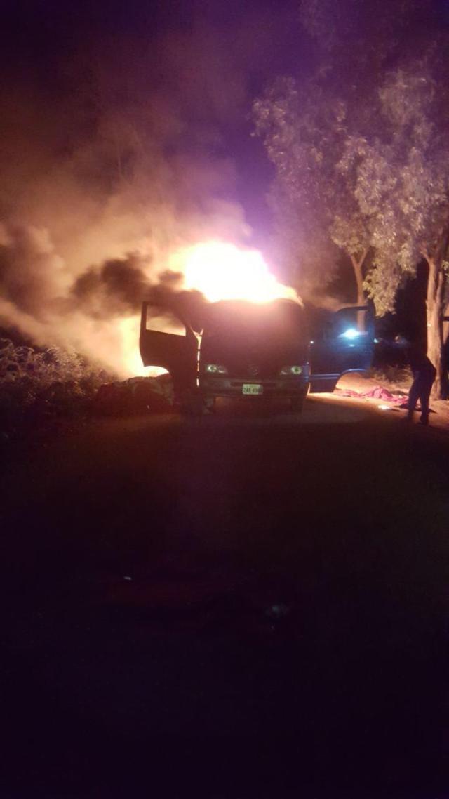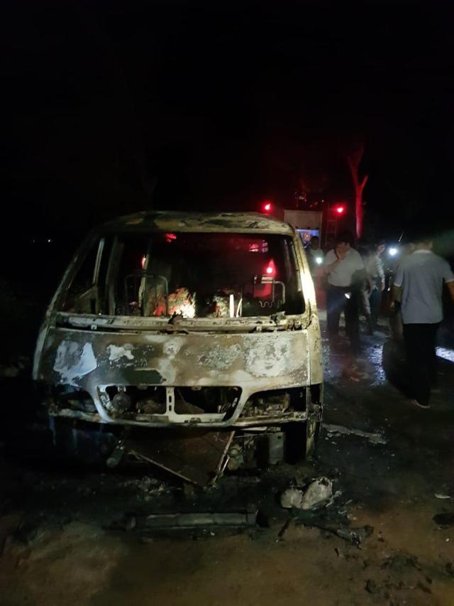 ចំណែករថយន្តបានបន្តឆាបឆេះយ៉ាងសន្ធោសន្ធៅ និងត្រូវអ្នកភូមិនាំគ្នាដកទឹកជះពន្លត់ ខណៈនោះស្របពេល ដែលមានភ្លៀងធ្លាក់មក ខ្លាំងផង ទើបធ្វើឱ្យភ្លើងបានរលត់ទៅវិញ ប៉ុន្តែរថយន្តត្រូវឆេះអស់ផ្នែកខាងមុខទាំងស្រុងទៅហើយ គ្រាន់តែមិនបង្ក ឱ្យមានគ្រោះថ្នាក់ដល់ជិះលើ រថយន្តឡើយ ។