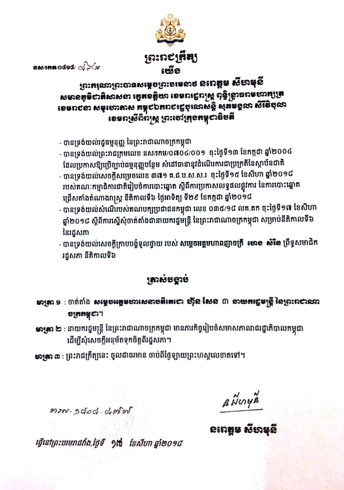 នៅថ្ងៃទី១៧ ខែសីហា ឆ្នាំ២០១៨ ព្រះមហាក្សត្រ នៃព្រះរាជាណាចក្រកម្ពុជា បានចេញព្រះរាជក្រឹត្យត្រាស់បង្គាប់តែងតាំងសម្តេចអគ្គមហាសេនាបតី តេជោ ហ៊ុន សែន ជា នាយករដ្ឋមន្រ្តី នៃព្រះរាជាណាចក្រកម្ពុជា ក្រោយពេលដែលគណបក្សប្រជាជនកម្ពុជា បានឈ្នះឆ្នោតភ្លូកទឹកភ្លូកដី ក្នុងអាណត្តិទី៦ កាលពីពេលថ្មីៗ ដែលប្រកាសដោយគណកម្មការជាតិរៀបចំការបោះឆ្នោត៕