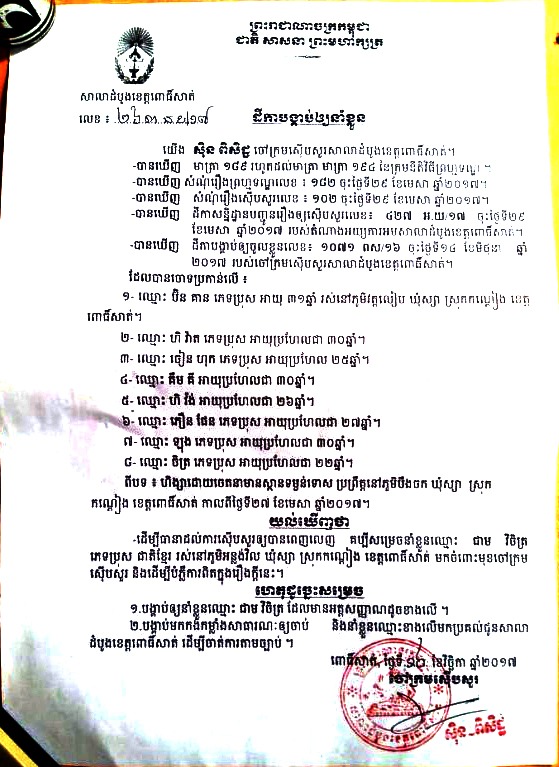 សមត្ថកិច្ចមូលដ្ឋាន បានបញ្ជាក់ថា ការចាប់ខ្លួនជនសង្ស័យខាងលើនេះ ធ្វើឡើងតាមដីកានាំខ្លួនលេខ ២៦៣ន.ខ/១៧ ចុះថ្ងៃទី១៦ ខែវិច្ឆិកា ឆ្នាំ២០១៧ របស់ចៅក្រមស៊ើបសួរ ស៊ិន ពិសិដ្ឋ ពាក់ព័ន្ធនឹងករណីហិង្សាមានស្ថានទម្ងន់ទោស ប្រព្រឹត្តនៅភូមិបឹងចក ឃុំស្យា ស្រុកកណ្តៀង កាលពីថ្ងៃទី២៧ ខែមេសា ឆ្នាំ២០១៧។