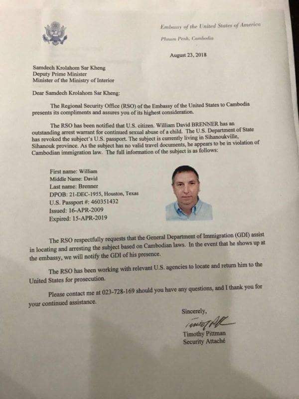 យោងតាមលិខិតរបស់ការិយាល័យសន្តិសុខភូមិភាគ (RSO) របស់ស្ថានទូតសហរដ្ឋអាមេរិកប្រចាំកម្ពុជា ផ្ញើជូនសម្តេច ស ខេង កាលពីថ្ងៃទី២៣ ខែសីហា ឆ្នាំ២០១៨ បានបញ្ជាក់ថា ការិយាល័យសន្តិសុខភូមិភាគ បានទទួលព័ត៌មានថា ពលរដ្ឋអាមេរិកាំងឈ្មោះ William David BRENNER មានដីកាចាប់ខ្លួនដែលមានសុពលភាព ពាក់ព័ន្ធនឹងបទរំលោភបំពានផ្លូវភេទជាបន្តបន្ទាប់ទៅលើកុមារ។