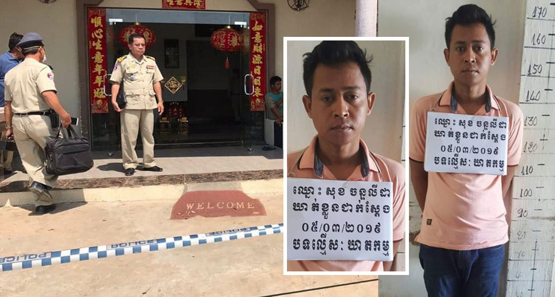 ខេត្តតាកែវ ៖ បន្ទាប់ពីស្រាវជ្រាវយ៉ាងយកចិត្តទុកដាក់ កាលពីវេលាម៉ោង១៥និង៤០នាទី ថ្ងៃទី០៥ ខែមីនា ឆ្នាំ២០១៩ សមត្ថកិច្ចបានឃាត់ខ្លួនឃាតករសម្លាប់នារីខារ៉ាអូខេ ក្នុងផ្ទះសំណាក់ “ប៉ាអុី ម៉ាអុី” នៅចំណុចភូមិថ្នល់បំបែក សង្កាត់ស្វាយក្រវ៉ាន់ ក្រុងច្បាមន ខេត្តកំពង់ស្ពឺ។
