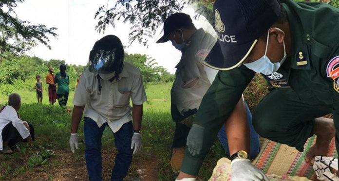 ក្រោយទទួលបានព័ត៌មានកម្លាំងប៉ុស្តិ៍ រួមសហការជាមួយកម្លាំងផ្នែកពិនិត្យកន្លែងកើតហេតុស្រុកស្អាង ប្រធានមណ្ឌលសុខភាពឃុំ ក្រុមប្រឹក្សាឃុំ អនុភូមិ ធ្វើការពិនិត្យសាកសពមានស្នាមជាំរង្វង់ក ក្រៅពីនេះពុំមានស្លាកស្នាមអ្វីគួរឱ្យកត់សំគាល់ឡើយ។ តាមការសន្និដ្ឋាន ជនរងគ្រោះស្លាប់ដោយសារចងកប្រាកដមែន។