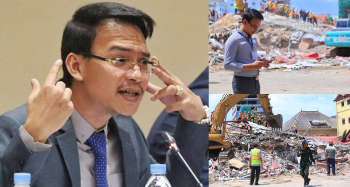 ខេត្តព្រះសីហនុ ៖ បន្ទាប់ពីទទួលបានព័ត៌មាននៃការបាក់ស្រុតអគារកម្ពស់៧ជាន់ កាលពីព្រឹកម៉ោង៥នេះនៅជិតកន្លែងលាងរថយន្តយីហោអារុណរះ ក្នុងសង្កាត់លេខ៤ ក្រុងព្រះសីហនុ ហើយត្រូវមន្ត្រីអ្នកនាំពាក្យក្រសួងដែនដី នគរូបនីយកម្ម និងសំណង់ បានប្រាប់ថា សំណង់អគារនេះមិនមានច្បាប់អនុញ្ញាត និងត្រូវអាជ្ញាធចុះហាមឃាត់២ដងមកហើយ តែម្ចាស់សំណង់មិនព្រមសហការ។ ស្រាប់តែប្រធានគណបក្សមួយ ចេញមុខនិយាយថា “ប្រសិនជាគ្មានច្បាប់សាងសង់ ម្ដេចបានបណ្ដោយអោយសាងសង់ ? បើឃាត់មិនស្ដាប់ម្ដេចមិនអនុវត្តន៍ច្បាប់?”។