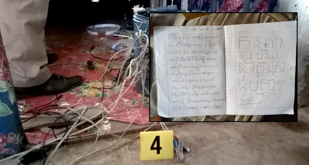 ប្រភពខាងលើ បញ្ជាក់ថា នៅពេលត្រឡប់មកដល់ផ្ទះ បុរសរងគ្រោះជាប្តីបានឡើងទៅសម្ងំនៅលើផ្ទះបាត់ ស្រាប់តែពេលប្រពន្ធមកដល់ ក៏ប្រទះឃើញប្តីដេកស្លាប់នៅក្បែរឧបករណ៍ឆក់ត្រី ដោយមានលិខិតចំនួន២សន្លឹកនៅក្បែរ សពប្តីរបស់ខ្លួនផង ទើបធ្វើឱ្យកើតមានការផ្អើលឆោឡោ និងរាយការណ៍ប្រាប់សមត្ថកិច្ចចុះមកពិនិត្យ។