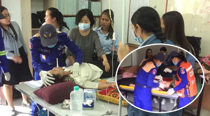 ភ្នំពេញ ៖ យុវតីជាសិស្សសាលាភាសាកូរ៉េម្នាក់ ខណៈកំពុងអង្គុយរៀនសុខៗស្រាប់តែមិនដឹងជាកើតមានអាការអ្វីក៏ដួលសន្លប់បាត់មាត់ឈឹង ធ្វើឱ្យកើតមានការផ្អើលឆោឡោពេញសាលា រាយការណ៍សុំអន្តរាគមន៍ពីរថយន្តសង្គ្រោះរបស់កងពលតូច៧១១ ចុះមកជួយដឹកបញ្ជូនទៅសង្គ្រោះនៅមន្ទីរពេទ្យភ្លាមៗ ។