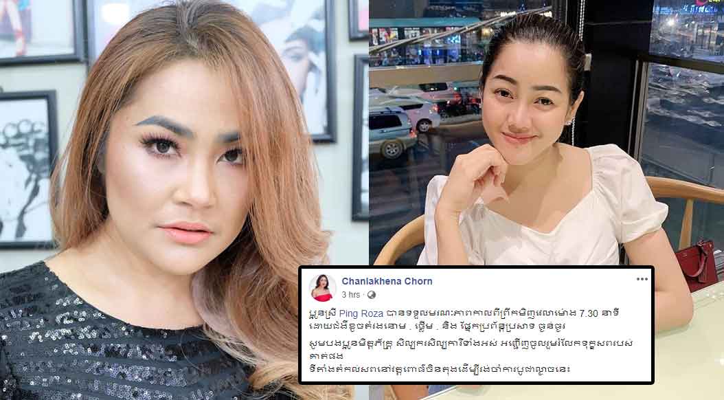 អ្នកនាងចន ច័ន្ទលក្ខិណា បានបង្ហោះសារថា “ប្អូនស្រី Ping Roza បានទទួលមរណៈភាពកាលពីព្រឹកមិញ វេលាម៉ោង7.30 នាទី ដោយជំងឺខូចតំរងនោម ថ្លើម និង ផ្នែកប្រព័ន្ធប្រសាទធ្ងន់ធ្ងរសូមបងប្អូន​មិត្តភក្តិ សិល្បករសិល្បការីទាំងអស់​ អញ្ជើញចូលរួមរំលែកទុក្ខសពរបស់​គាត់ផង