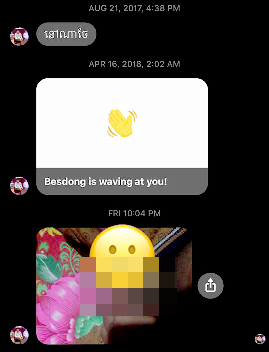 ភ្នំពេញ ៖ នារីរូបស្រស់ម្នាក់កំពុងរៀបចំខ្លួនចូលគេងទៅហើយ ស្រាប់តែត្រូវយុវជនម្នាក់បានឆាតចូលមកគណនីហ្វេសប៊ុករបស់ខ្លួន លុះពេលស្រីស្អាតបើកមើល ក៏ស្រាប់តែឃើញម្ចាស់គណនីហ្វេសប៊ុកនោះ ផ្ញើរូបភាពប្រដាប់ភេទរបស់គេឱ្យនាង៧មើលទាំងកណ្តាលយប់ ជាហេតុធ្វើឱ្យស្រីស្អាតផ្ទុះកំហឹងទប់មិនជាប់ ក៏បង្ហោះទាំងឆាតទាំងមុខមាត់យុវជនខាងលើ ធ្វើឱ្យកើតមានការភ្ញាក់ផ្អើលពេញក្នុងបណ្តាញសង្គមហ្វេសប៊ុក។