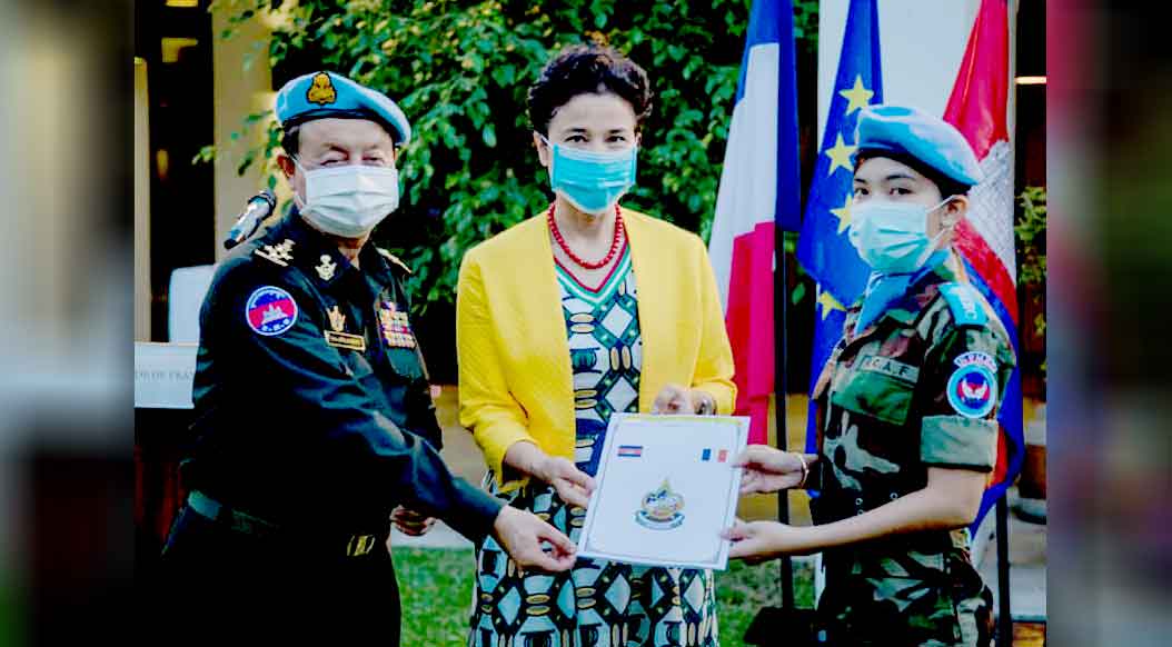 ភ្នំពេញ ៖ កាលពីល្ងាចថ្ងៃទី២៦ ខែវិច្ឆិកា ឆ្នាំ២០២០ ទាហាននៃកងយោធពលខេមរភូមិន្ទចំនួនជាង១០០នាក់ បានចូលរួមពិធីប្រគល់សញ្ញាបត្រភាសាបារាំង នៅស្ថានទូតបារាំងប្រចាំកម្ពុជា ក្រោមអធិបតីភាពលោកស្រីអេវ៉ា ង្វៀនប៊ិញ ឯកអគ្គរដ្ឋទូតបារាំង ប្រចាំកម្ពុជា ។