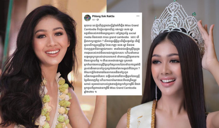 អ្នកលេងហ្វេសប៊ុកម្នាក់ ដែលមានឈ្មោះថា Phlong Sok Raksa បានចេញមករិះគន់ពីអត្តចរិតរបស់បវរកញ្ញាឯក “Miss Grand Cambodia” ក្រោយជ្រុះមកុដ ដែលមានទាំងសំណេរមួយយ៉ាងគួរឲ្យចាប់អារម្មណ៍ពីមហាជន។