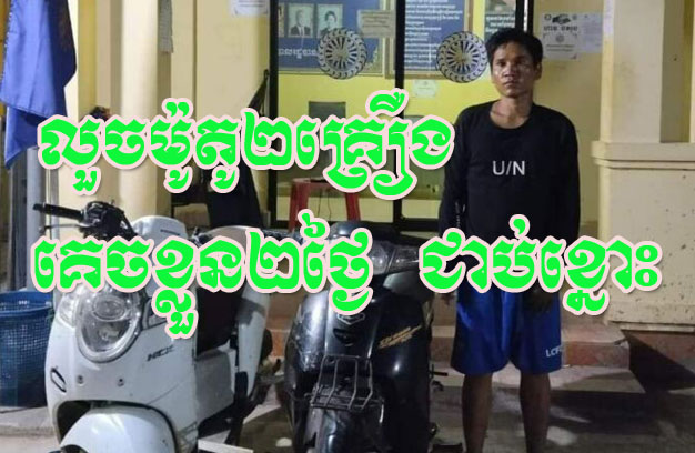 ខេត្តបន្ទាយមានជ័យ ៖ ជនសង្ស័យម្នាក់ បានធ្វើសកម្មភាពលួចម៉ូតូរបស់ប្រជាពលរដ្ឋ ជាបន្តបន្ទាប់ បានចំនួន ២គ្រឿង ក្នុងថ្ងៃតែមួយ និងព្យាយាមគេចទៅសម្ងំលាក់ខ្លួនបានត្រឹម២ថ្ងៃ ក៏ត្រូវសមត្ថកិច្ចស្រាវជ្រាវតាមវ៉ៃខ្នោះ ដល់បន្ទប់ជួល នាំយកមកចាត់ការតាមច្បាប់។