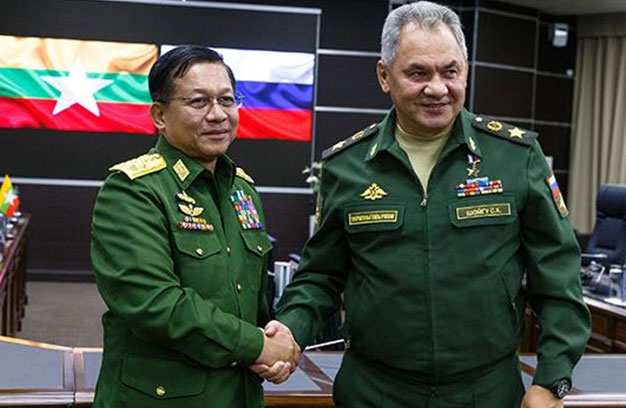 រុស្សីគឺជាប្រទេសផ្តល់សព្វាវុធយោធាដ៏សំខាន់សម្រាប់មីយ៉ាន់ម៉ានិងជាប្រទេសដំបូងគេដែលបញ្ចេញសំឡេងគាំទ្ររបបយោធាបន្ទាប់ពីរដ្ឋប្រហារនៅពេលដែលប្រទេសនេះកំពុងទទួលបានការថ្កោលទោសពីអន្តរជាតិជុំវិញការប្រើប្រាស់កម្លាំងដ៍សាហាវរបស់ខ្លួនប្រឆាំងនឹងគូប្រជែង។