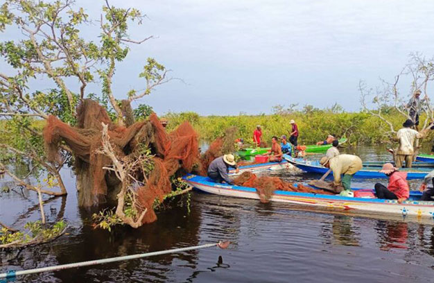 ខេត្តបាត់ដំបង ៖ ដើម្បីតាមឱ្យទាន់ល្បិចកលរបស់ជនល្មើស ដែលព្យាយាមទាញពន្លិចឧបករណ៍នេសាទ (ស្បៃមង) ខុសច្បាប់ទៅក្នុងទឹកជ្រៅ ចៀសវាងកុំឱ្យសមត្ថកិច្ចឃើញ និងបង្ក្រាបបាន ពេលនេះកម្លាំងចម្រុះរបស់ស្រុកឯកភ្នំ បានប្រើកម្លាំងជំនាញមុជទឹក តាមបង្ក្រាប បទល្មើសនានាដល់បាតទឹក នៅតាមតំបន់នានាដែលសង្ស័យថាមានបង្កប់នូវឧបករណ៍នេសាទខុសច្បាប់ រហូតរកឃើញឧបករណ៍ល្មើសច្បាប់ (ស្បៃមង) រាប់រយម៉ែត្រ។