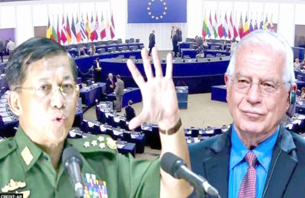 ដោយមើលឃើញពីការកើនឡើងនៃអំពើហិង្សា និងការរំលោភសិទ្ធិមនុស្សកាន់តែធ្ងន់ធ្ងរ ដឹកនាំដោយប្រមុខយោធាលោកមីងអ៊ុងឡាំង ចាប់តាំងពី ឡើងកាន់អំណាច កាលពីពីរឆ្នាំមុន សហភាពអឺរ៉ុប (EU) បានអនុម័តកញ្ចប់ទណ្ឌកម្មទី៦ដាក់ទៅលើរបបយោធាមីយ៉ាន់ម៉ាពីបទរំលោភសិទ្ធិមនុស្ស។ កញ្ចប់ទណ្ឌកម្មទី៥ បានដាក់កាលពីខែវិច្ឆិកា ឆ្នាំមុន។