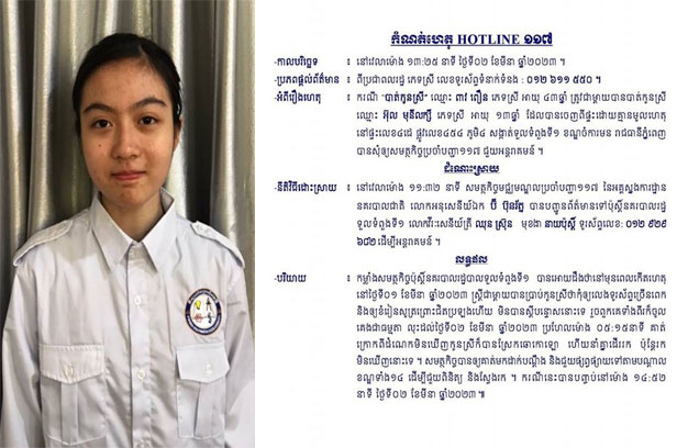 តាមប្រភពពីសមត្ថកិច្ចប្រចាំបញ្ជា ១១៧ បានឱ្យដឹងថា កាលពីវេលាម៉ោង ១និង២៥នាទីរសៀល ថ្ងៃទី០២ ខែមីនា ឆ្នាំ២០២៣ មានប្រជាពលរដ្ឋ ភេទស្រី បានរាយការណ៍ពីករណី បាត់កូនស្រី ឈ្មោះ អ.ម.ន.ល អាយុ១៣ឆ្នាំ ដែល បានចេញពីផ្ទះ ដោយគ្មានមូលហេតុ នៅផ្ទះលេខ៤ដេ ផ្លូវលេខ៤៥៤ ភូមិ៤ សង្កាត់ទួលទំពូងទី១ ខណ្ឌចម្ការមន និងបានស្នើសុំឱ្យសមត្ថកិច្ចប្រចាំបញ្ជា១១៧ ជួយអន្តរាគមន៍។