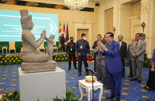 ភ្នំពេញ ៖ នៅព្រឹកថ្ងៃសុក្រ ១១រោច ខែផល្គុន ឆ្នាំខាល ចត្វាស័ក ព.ស. ២៥៦៦ ត្រូវនឹងថ្ងៃទី១៧ ខែមីនា ឆ្នាំ២០២៣ សម្ដេចហ៊ុន សែន នាយករដ្ឋមន្ត្រី នៃព្រះរាជាណាចក្រកម្ពុជា បានអញ្ជើញជាអធិបតីភាពដ៏ខ្ពង់ខ្ពស់ នៅក្នុងពិធី ទទួលវត្ថុបុរាណខ្មែរ ដែលជារតនសម្បត្តិវប្បធម៌ខ្មែរ ដែលបានបាត់បង់អស់ពេលជាយូរមកហើយ ត្រូវបានប្រ គល់ជូនព្រះរាជាណាចក្រកម្ពុជា វិញ។ ពិធីនេះបានប្រព្រឹត្តទៅនៅវិមានសន្តិភាព នៃទីស្ដីការនាយករដ្ឋមន្ត្រី។
