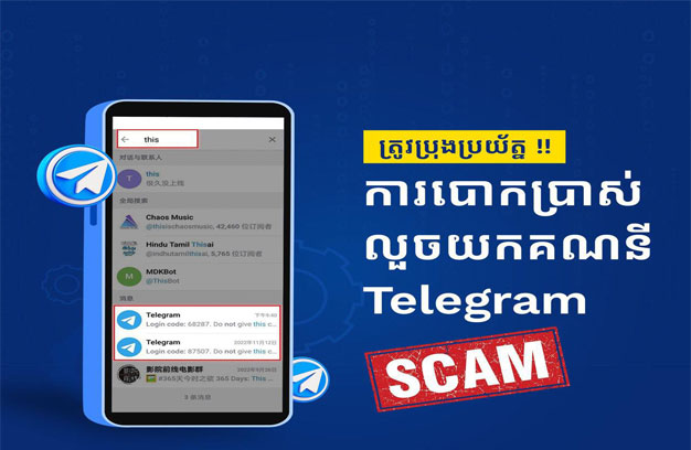ភ្នំពេញ ៖ សមត្ថកិច្ចនាយកដ្ឋានប្រឆាំងបទល្មើសបច្ចេកវិទ្យា (Anti Cyber Crime Department) បានដាស់តឿន ក្រើនរំឭកដល់បងប្អូនប្រជាពលរដ្ឋ ឲ្យមានការប្រុងប្រយ័ត្ន ជាមួយនឹងការឆបោកតាមកម្មវិធីតេឡេក្រាម (Telegram)។