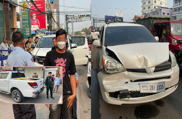 ភ្នំពេញ ៖ រថយន្តតាក់ស៊ី ១គ្រឿង ហេតុតែចង់ធ្វើដំណើរលឿន ឆាប់រហ័ស គ្រាន់តែឃើញមានក្បួនរថយន្តថ្នាក់ ដឹកនាំបើកឆ្លងកាត់ ក៏បើកប្រដេញតាមពីក្រោយ រួចជ្រុលទៅបុកពីក្រោយរថយន្តស៊ីរ៉ែន ដែលជារថយន្តការពារ ក្បួនថ្នាក់នាំ ពេញទំហឹង បណ្តាលឱ្យរងការខូចខាតផ្នែកខាងមុខយ៉ាងដំណំ។