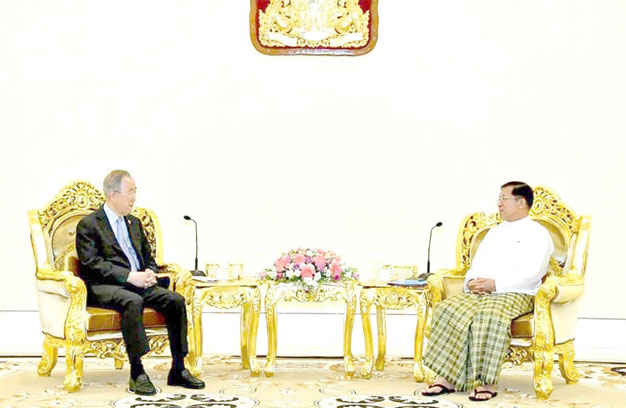 កាសែតនោះបានចុះផ្សាយថា លោកបានគីម៉ូន និងប្រមុខរបបយោធា មីនអ៊ុងឡាំង បាន ផ្លាស់ប្តូរទស្សនៈស្តី ពីវឌ្ឍនភាពចុងក្រោយបង្អស់របស់ប្រទេសមីយ៉ាន់ម៉ាហើយបានពិភាក្សាយ៉ាងស្និទ្ធស្នាលជាមួយនឹងអាកប្បកិរិយាស្ថាបនាតែមិនបានផ្តល់ព័ត៌មានលម្អិតទេ.