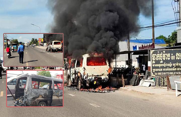 ដឹកភ្ញៀវទៅលេងកំពត ផ្ទុះឆេះឡានកណ្តាលផ្លូវ