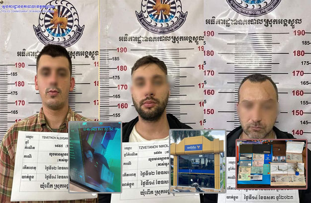 រីឯវត្ថុតាងចាប់យក រួមមាន ១-រថយន្តម៉ាកតូយ៉ូតា ព្រូស ពណ៌ខ្មៅ ពាក់ស្លាកលេខ ភ្នំពេញ 2BN-6061។ ២-LAPTOP ០១គ្រឿង ម៉ាក ACER ពណ៌ទឹកប្រាក់។ ៣-ទូរស័ព្ទចំនួន ៣គ្រឿង (ម៉ាក iPhone 13 ពណ៌ក្រហម ម៉ាក OPPO ពណ៌ខៀវ និងម៉ាក SAMSUNG ពណ៌ខ្មៅ)។ ៤-លិខិតឆ្លងដែន ចំនួន៣ក្បាល (ឈ្មោះ TSVETKOV ALEKSANDAR GEORGIVE ឈ្មោះ TZVETANOV NIKOLAY ANDREEV និងឈ្មោះ NIKOLAEV IVELIN DIMITROV)។ ៥-អត្តសញ្ញាណប័ណ្ណ ចំនួន៤ (ឈ្មោះTSVETKOV ALEKSANDAR GEORGIVE ចំនួន២សន្លឹក ឈ្មោះ TZVETANOV NIKOLAY ANDREEV ០១សន្លឹក និងឈ្មោះ NIKOLAEV IVELIN DIMITROV ០១សន្លឹក)។ ៦-កាត ចំនួន៦សន្លឹក។ ៧-កាបូបដាក់ប្រាក់ ចំនួន៣។ ៨-ប័ណ្ណសម្គាល់យានជំនិះ ថតចម្លង ១សន្លឹក។ ៩-រូបថត 4×6 ចំនួន១០សន្លឹក។ ១០-ដែកតាន់ រាងអក្សរ L មុខសំប៉ែត សម្រាប់ឆ្កឹះសោ១ ដែកសំប៉ែតរាងអក្សរ Z ១ ដែកលួស ១សរសៃ ប្រវែង១០សង់ទីម៉ែត្រ កូនកាំបិតរូត ពណ៌ក្រហម១ និងផ្លែកាំបិតមួយប្រអប់ ស្រោមម៉ាលេត១។ ១១-កូនសោ ចំនួន ៥។ ១២-មួកឆាង ចំនួន៦មួក ស្រោមដៃ ១គូ ម៉ាស់ក៍ពណ៌លឿង១។