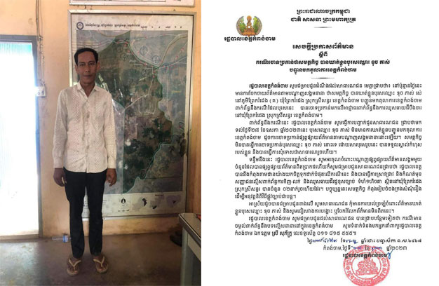 ទន្ទឹមនឹងនេះ រដ្ឋបាលខេត្តកំពង់ចាម សូមអរគុណចំពោះបណ្តាញផ្សព្វផ្សាយព័ត៌មានសង្គមមួយចំនួន ដែលបាន ផ្សព្វផ្សាយព័ត៌មានពិតប្រាកដ ហើយក៏សូមជម្រាបជូនសាធារណជនជ្រាបថា រដ្ឋបាលខេត្ត បាននិងកំពុងតាម ដាន យ៉ាងយកចិត្តទុកដាក់បំផុតលើករណីនេះ និងបានធ្វើការស្រាវជ្រាវនិងកំណត់មុខសញ្ញា ជនល្មើស ពាក់ ព័ន្ធការទិញ-លក់ និងឈូសឆាយដីរដ្ឋខុសច្បាប់ ទំហំ ១ហិកតារ ស្ថិតនៅឃុំព្រែករំដេង ស្រុកស្រីសន្ធរ បានចំនួន ២នាក់ រួចហើយដែរ។ បច្ចុប្បន្ននេះ សមត្ថកិច្ចកំពុងរៀបចំចងក្រងសំណុំរឿង ដើម្បីអនុវត្តនីតិវិធីផ្លូវច្បាប់ ជាបន្ត។