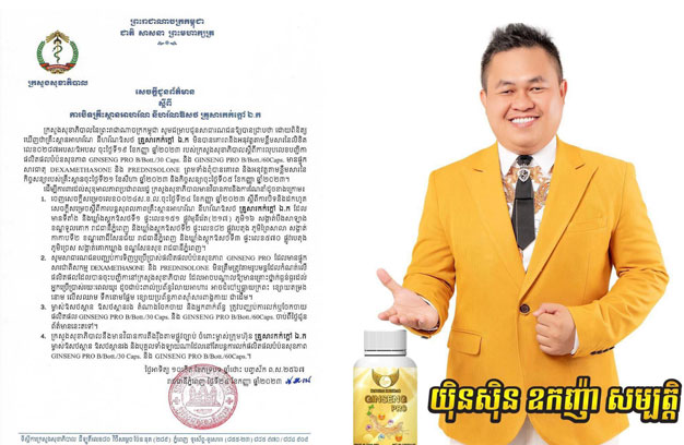 ដោយឡែក កាលពីថ្ងៃទី២០ ខែកញ្ញា ឆ្នាំ២០២៣ ក្រសួងសុខាភិបាល ក៏បានចេញសេចក្តីជូនព័ត៌មាន ស្តីពីការ លុបលេខបញ្ជីកាផលិតផលបំប៉នសុខភាព GINSENG PRO B/Bott./30Caps. GINSENG PRO B/Bott./60Caps. ដោយបញ្ជាក់ថា «ក្រសួងសុខាភិបាល នៃព្រះរាជាណាចក្រកម្ពុជា សូមជម្រាបជូនដល់សាធារណជនទាំងអស់ ឱ្យបានជ្រាបថា យោងតាមការវិភាគគុណភាពនៅមជ្ឈមណ្ឌលជាតិពិសោធន៍សុខាភិបាល នៃក្រសួងសុខាភិ បាល បានបញ្ជាក់ថា ផលិតផលបំប៉នសុខភាព GINSENG PRO B/Bot./30Caps. Lot No: 20230405, MFG DATE: 04-2023, EXP.DATE:04-2026 មានផ្ទុកសារធាតុ DEXAMETHASONE និង PREDNISOLONE ដែលនាំឱ្យប៉ះពាល់ធ្ងន់ធ្ងរដល់សុខភាពរបស់អ្នកប្រើប្រាស់។