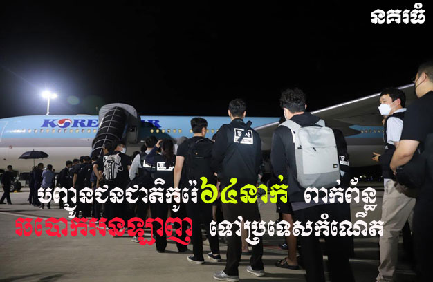ភ្នំពេញ ៖ មន្ត្រីនៃអគ្គនាយកដ្ឋានអន្តោប្រវេសន៍ នៃក្រសួងមហាផ្ទៃ ប្រទេសកម្ពុជា កាលពីយប់ថ្ងៃទី១៧ ខែតុលា ឆ្នាំ២០២៥ បានបញ្ជូនជនជាតិកូរ៉េ សរុបចំនួន៦៤នាក់ ក្នុងនោះមានស្ត្រីចំនួន៥នាក់ ដែលជាប់ពាក់ព័ន្ធនឹងការឆ បោកតាមប្រព័ន្ធបច្ចេកវិទ្យា ឱ្យត្រឡប់ទៅប្រទេសដើមរបស់ពួកគេវិញ ដើម្បីឱ្យរដ្ឋាភិបាលសាធារណរដ្ឋកូរ៉េ ចាត់វិធានការ និងអនុវត្តនីតិវិធីបន្ត។