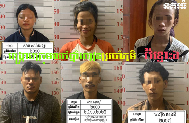 ជនសង្ស័យទាំង៦នាក់ (ស្រី៣នាក់) ដែលត្រូវបានសមត្ថកិច្ចបង្ក្រាបបាន រួមមាន ទី១-ឈ្មោះភ្លី សារុះ ភេទស្រី អាយុ៣០ឆ្នាំ ជនជាតិខ្មែរអ៊ិស្លាម មុខរបរមិនពិតប្រាកដ មានលំនៅ ភូមិបារ៉េនលើ ឃុំស្វាយប្រទាល ស្រុកស្អាង (មានសារធាតុញៀន)។ ទី២-ឈ្មោះសៀង ផាន់នី ភេទប្រុស អាយុ១៨ឆ្នាំ មុខរបរមិនពិតប្រាកដ មានលំនៅ ភូមិក្នុងព្រែក ឃុំព្រែកគយ ស្រុកស្អាង (មានសារធាតុញៀន)។ ទី៣-ឈ្មោះលី បូឡា ភេទប្រុស អាយុ៣៧ឆ្នាំ មុខរបរមិនពិតប្រាកដ មានលំនៅភូមិព្រៃសាលា ឃុំព្រៃសាលា ស្រុកកំពង់ត្រឡាច ខេត្តកំពង់ឆ្នាំង (មានសារ ធាតុ ញៀន)។ ទី៤-ឈ្មោះសុខ សុវណ្ឌី ភេទប្រុស អាយុ២៤ឆ្នាំ មុខរបរមិនពិតប្រាកដ មានលំនៅ ភូមិលេខ២ សង្កាត់ស្វាយរលំ ក្រុងតាខ្មៅ (មាន សារធាតុញៀន)។ ទី៥-ឈ្មោះចន ស្រីខួច ភេទស្រី អាយុ២១ឆ្នាំ មុខរបរមិនពិតប្រាកដ មានលំនៅ ភូមិព្រែករុនក្រោម ឃុំព្រែកគយ ស្រុកស្អាង (មានសារធាតុញៀន) និងទី៦-ឈ្មោះសាន់ សារ៉ាអេឡា ភេទស្រី អាយុ១៥ឆ្នាំ មុខរបរមិនពិតប្រាកដ មានលំនៅ ភូមិព្រែករុនក្រោម ឃុំព្រែកគយ ស្រុកស្អាង (មានសារធាតុញៀន)។