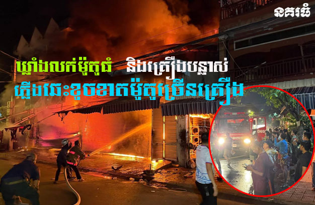 ភ្នំពេញ ៖ ឃ្លាំងស្តុកនិងលក់ម៉ូតូជប៉ុន ធុនធំ ១កន្លែង មានស្តុកទុកម៉ូតូ រាប់រយគ្រឿង ត្រូវបានអគ្គិភ័យឆាបឆេះយ៉ាងសន្ធោសន្ធៅ ផ្អើលពលរដ្ឋនិងសមត្ថកិច្ចជំនាញ ចេញរថយន្តពន្លត់អគ្គិភ័យអន្តរាគមន៍បាញ់ទឹកពន្លត់ អស់ប្រមាណជាង១០០ឡាន ទើបអាចគ្រប់គ្រងស្ថានការណ៍បាន។ ប៉ុន្តែម៉ូតូជាច្រើគ្រឿង និងគ្រឿងបន្លាស់មួយចំនួន ត្រូវបានភ្លើងឆេះខូចខាត ដោយអូសជញ្ជូនចេញមិនទាន់។