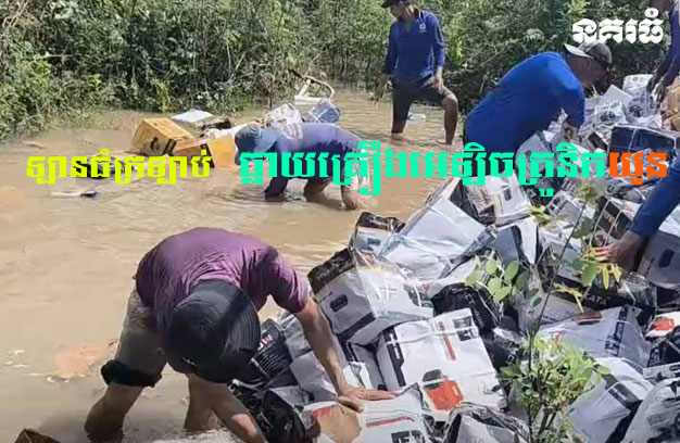 រថយន្តដឹកទំនិញនេះ គ្មានស្លាកលេខ បានក្រឡាប់បណ្តាលឱ្យទំនិញជាប្រភេទគ្រឿងអេឡិចត្រូនិក នាំចូលពីប្រទេសវៀតណាម បានធ្លាក់ចូលប្រឡាយទឹក។