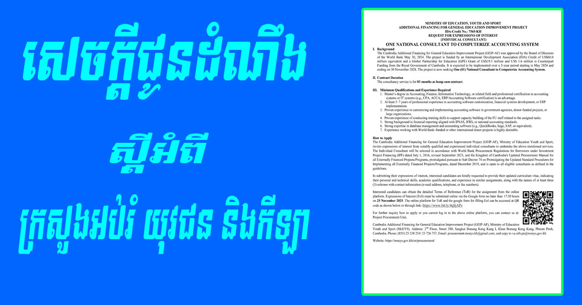 Homeព័ត៌មានជាតិសេចក្តីជូនដំណឹង ស្តីអំពីក្រសួងអប់រំ យុវជន និងកីឡា ព័ត៌មានជាតិ សេចក្តីជូនដំណឹង ស្តីអំពីក្រសួងអប់រំ យុវជន និងកីឡា By Davin November 12, 2025 0 0 Share FacebookTwitterPinterestWhatsApp RELATED ARTICLES ព័ត៌មានជាតិ សេចក្តីជូនដំណឹង ស្តីអំពីក្រសួងអប់រំ យុវជន និងកីឡា November 12, 2025 ព័ត៌មានជាតិ សេចក្តីជូនដំណឹង ស្តីអំពីក្រសួងអប់រំ យុវជន និងកីឡា November 12, 2025 ព័ត៌មានជាតិ សេចក្តីជូនដំណឹង ស្តីអំពីក្រសួងអប់រំ យុវជន និងកីឡា November 12, 2025
