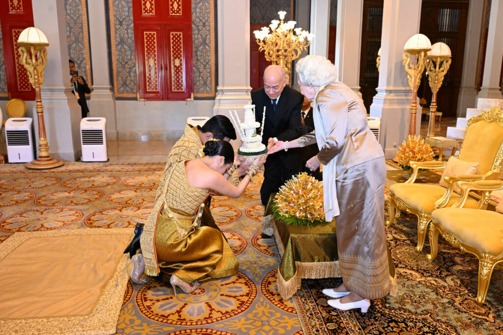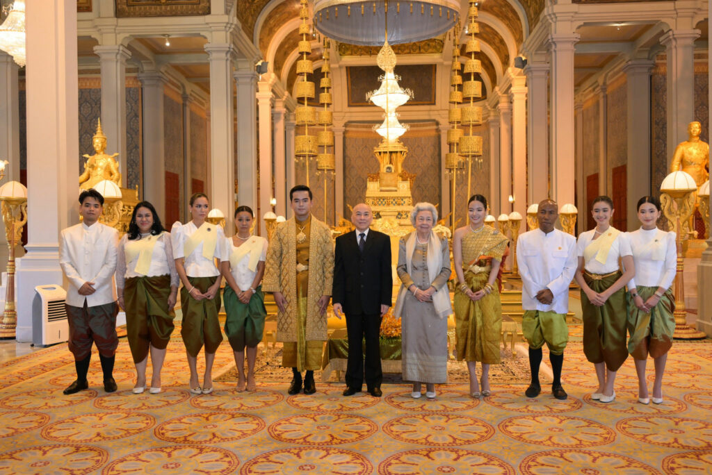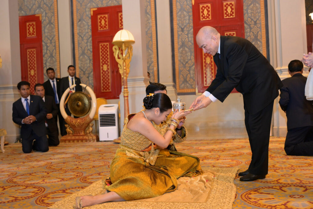 ព្រះករុណាជាអម្ចាស់ជីវិតលើត្បូង និងសម្ដេចព្រះមហាក្សត្រី ព្រះវររាជមាតាជាតិខ្មែរ ជាទីគោរពសក្ការដ៏ខ្ពង់ខ្ពស់បំផុត ព្រះអង្គទាំងទ្វេ សព្វព្រះរាជហឫទ័យប្រោសព្រះរាជទានសម្ដេចក្រុមព្រះ នរោត្តម ចក្រពង្ស់ ឧត្ដម ប្រឹក្សាផ្ទាល់ព្រះមហាក្សត្រ នាំព្រះបុត្រាបុត្រី ថ្វាយបង្គំទទួលព្រះតេជៈ ព្រះពរតាមព្រះរាជបវេណីដ៏ថ្កើងថ្កាន។