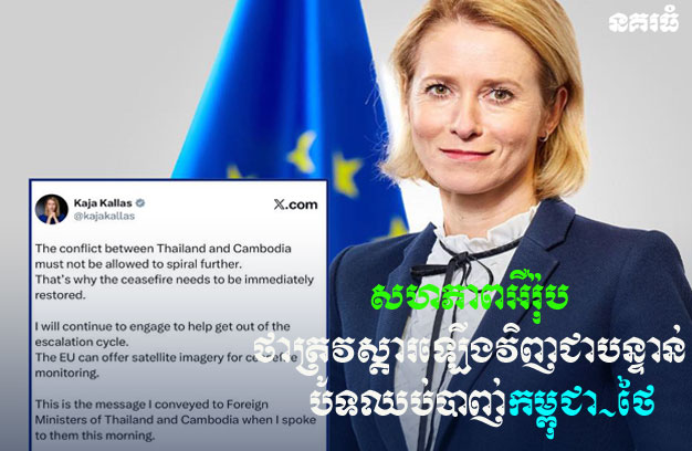 ភ្នំពេញ ៖ លោកស្រី កាចា កាឡាលស (Kaja Kallas) តំណាងជាន់ខ្ពស់សហភាពអឺរ៉ុប ទទួលបន្ទុកកិច្ចការបរទេស និងគោលនយោបាយសន្តិសុខ និងជាអនុប្រធានគណៈកម្មការអឺរ៉ុប បានថ្លែងថា ជម្លោះរវាងប្រទេសកម្ពុជា និងប្រទេសថៃ មិនត្រូវបណ្តោយឱ្យរាលដាលកាន់តែធ្ងន់ឡើយ។ ហេតុដូច្នេះ បទឈប់បាញ់ ចាំបាច់ត្រូវតែស្តារឡើងវិញជាបន្ទាន់។ លោកស្រី នឹងបន្តកិច្ចការនេះ ដើម្បីជួយបញ្ចប់ការកើនឡើងជម្លោះ ហើយសហ ភាពអឺរ៉ុប អាចផ្តល់ជូននូវរូបភាពពីផ្កាយរណប សម្រាប់ការឃ្លាំមើលបទឈប់បាញ់។