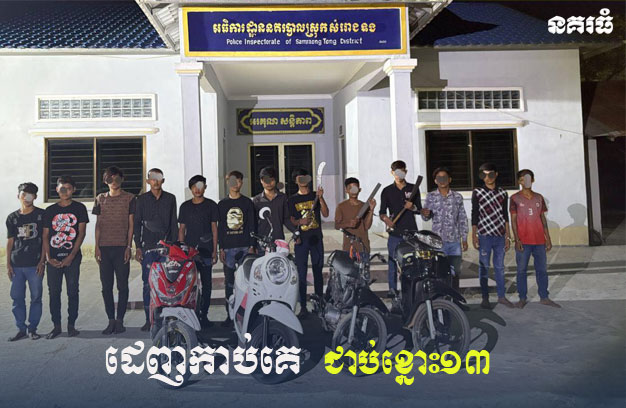 ខេត្តកំពង់ស្ពឺ ៖ ក្មេងទំនើង ១ក្រុម ដែលជាមុខសញ្ញាដេញកាប់អ្នកដំណើរ មិនរើសមុខ ពេលយប់ ត្រូវបានកម្លាំងសមត្ថកិច្ចជំនាញ បើកប្រតិបត្តិការបង្ក្រាប ឃាត់ខ្លួនសរុបចំនួន ១៣នាក់ ព្រមទាំងដកហូតបានម៉ូតូ ៤គ្រឿង និងដាវ កាំបិត ចំនួន៣ដើម។