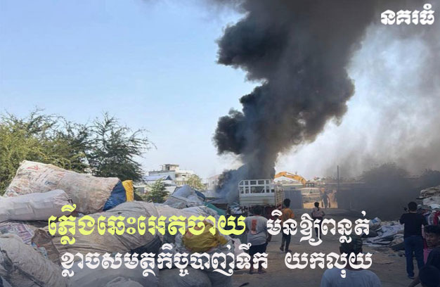 ភ្នំពេញ ៖ គំនរអេតចាយមួយកន្លែងដែលមានសុទ្ធតែជាគ្រឿងជ័រ ត្រូវបានភ្លើងឆាបឆេះសន្ធោសន្ធៅ និងផ្សែងហុយឃ្មួលខ្មាញ់ បង្កឱ្យមានការភ្ញាក់ផ្អើលទាំងថ្ងៃ ដែលសង្ស័យបណ្តាលមកពីក្មេងៗ ដុតភ្លើងលេង ភ្លាមៗនោះម្ចាស់ទីតាំងអេតចាយ បានយកគ្រឿងចក្រកាយអេតចាយ ផ្តាច់គំនរចេញពីគ្នា និងកាយដីលុបភ្លើង ព្រមទាំងយកទុយោបាញ់ទឹកពន្លត់ភ្លើង  ហើយភ្លាមនោះ រថយន្តពន្លត់អគ្គិភ័យ ក៏បានចុះទៅដល់ ដើម្បីអន្តរាគមន៍ដែរ  តែត្រូវបានម្ចាស់ទីតាំងរារាំងមិនឱ្យរថយន្តពន្លត់អគ្គិភ័យ បាញ់ទឹកពន្លត់ទេ ដោយខ្លាចរថយន្តពន្លត់អគ្គិភ័យ យកលុយកាក់ រហូតដល់មានអន្តរាគមន៍ពីលោកចៅសង្កាត់ត្រពាំងក្រសាំង ទើបម្ចាស់ទីតាំងយល់ព្រមឱ្យឡានទឹក បាញ់ពន្លត់ អស់ទឹក១ឡាន ទើបភ្លើងរលត់ទាំងស្រុង។