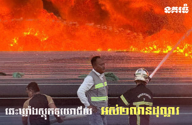 ខេត្តបាត់ដំបង ៖ ទីតាំងស្តុកទុយោជ័រ ខ្នាតធំ ១កន្លែង របស់ក្រុមហ៊ុនគិរីដងរែក ត្រូវបានអគ្គិភ័យឆាបឆេះយ៉ាងសន្ធោសន្ធៅ បណ្តាលឱ្យរងការខូចខាតអស់ទាំងស្រុង គិតពីទំហំនៃការខូចខាត ជាទឹកប្រាក់ប្រមាណ ២លានដុល្លារ។
