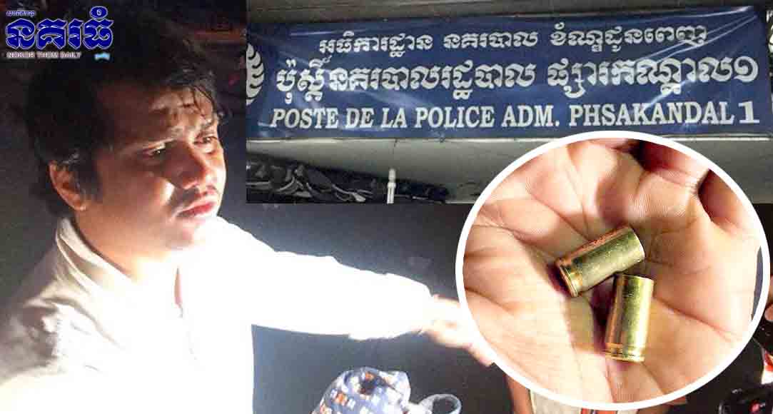 ភ្នំពេញ ៖ យុវជនម្នាក់បានដើរបណ្តើរស្រែកឡូឡាបណ្តើរ រកប្រពន្ធរបស់ខ្លួនដែលធ្វើការនៅហាងមួយកន្លែង ស្រាប់តែលេចមុខបុរសម្នាក់ដើរចេញពីក្នុងហាងក្បែរនោះ ដកកាំភ្លើងបាញ់គំរាមយុវជននោះចំនួន២គ្រាប់ បង្កឱ្យមានការភ្ញាក់ផ្អើលយ៉ាងខ្លាំង ហើយភ្លាមនោះជនសង្ស័យដែលបាញ់បោះសេរី បានឡើងម៉ូតូជិះគេចខ្លួនបាត់ស្រមោល។