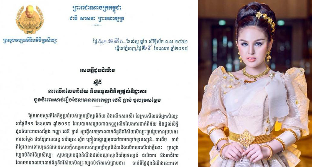 ផ្អែកតាមស្មារតីនៃកិច្ចប្រជុំរបស់ក្រុមប្រឹក្សាពិន័យ និងលើកសរសើរនៃក្រមសីលធម៌អ្នកសិល្បៈ នាថ្ងៃទី១១ ខែឧសភា ឆ្នាំ២០១៨ ដែលបានសម្រេចជាឯកច្ឆន្ទលើកលែងការដាក់ពិន័យ និងផ្តល់សិទ្ធិជូនចំពោះតារាសម្តែង ដេនី ក្វាន់ ឱ្យធ្វើសកម្មភាពពាក់ព័ន្ធនឹងវិស័យសិល្បៈគ្រប់រូបភាព រួមមាន ៖ ការសម្តែង​ថតខ្សែភាពយន្ត ខារ៉ាអូខេ ស៉្ពត ច្រៀងបង្ហាញមុខនៅតាមកញ្ចក់ទូរទស្សន៍…ជាដើម ចាប់ពីថ្ងៃនេះតទៅ រហូតដល់មានសេចក្តីសម្រេចរបស់ក្រុមប្រឹក្សពិន័យ និងលើកសរសើរជាថ្មីនោះ ក្រសួងវប្បធម៌ និងវិចិត្រសិល្បៈ សូមជម្រាបជូនដំណឹងដល់បណ្តាស្ថានីយទូរទស្សន៍ ផលិតករ និងអាជីវករ ដែលមានផលរបរពាក់ព័ន្ធនឹងវិស័យសិល្បៈ វប្បធម៌ទាំងអស់ជ្រាបថា ៖ ចាប់ពីថ្ងៃជូនដំណឹងនេះតទៅ ក្រសួងវប្បធម៌ និងវិចិត្រសិល្បៈ នឹងទទួលពិនិត្យ ព្រមទាំងផ្តល់ទិដ្ឋការជូនដល់សាច់រឿង ដែលមានតួអង្គ កញ្ញាដេនី ក្វាន់ សម្តែងជាប្រក្រតីឡើងវិញ។
