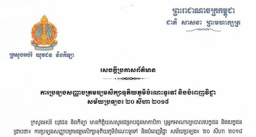 យោងតាមសេចក្តីប្រកាសព័ត៌មានរបស់ក្រសួងអប់រំ យុវជន និងកីឡា ចុះថ្ងៃព្រហស្បតិ៍ 1រោច ខែបឋមាសាឍ ឆ្នាំច សំរឹទ្ធិស័ក ព.ស 2562 ត្រូវនឹងថ្ងៃទី28 ខែមិថុនា ឆ្នាំ2018 ស្តីពីការប្រឡងសញ្ញាបត្រមធ្យមសិក្សាទុតិយភូមិចំណេះទូទៅ និងបំពេញវិជ្ជា សម័យប្រឡង ៖ 20 សីហា 2018 បានបញ្ជាក់ថា “ក្រសួងអប់រំ យុវជន និងកីឡា មានកិត្តិយសសូមជម្រាបជូនមាតាបិតា ឬអ្នកអាណាព្យាបាលបេក្ខជន និងបេក្ខជនជ្រាបថា ៖ ការប្រឡងសញ្ញាបត្រមធ្យមសិក្សា ទុតិយភូមិ ចំណេះទូទៅ និងបំពេញវិជ្ជា សម័យប្រឡង ៖ 20 សីហា 2018 ដែលមានថ្នាក់វិទ្យាសាស្ត្រ និងថ្នាក់វិទ្យាសាស្ត្រសង្គម រួមមាន បេក្ខជនប្រឡងសរុបចំនួន117061នាក់ និងមានមណ្ឌលប្រឡងចំនួន 195មណ្ឌល ចែកចេញជា 4716បន្ទប់ នៅរាជធានីខេត្ត ទាំង25 នៃព្រះរាជាណាចក្រកម្ពុជា។